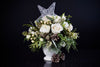 This sparking white arrangement with fresh holiday greens and white florals adorned with a shiny metallic star will brighten anyone's holiday table!